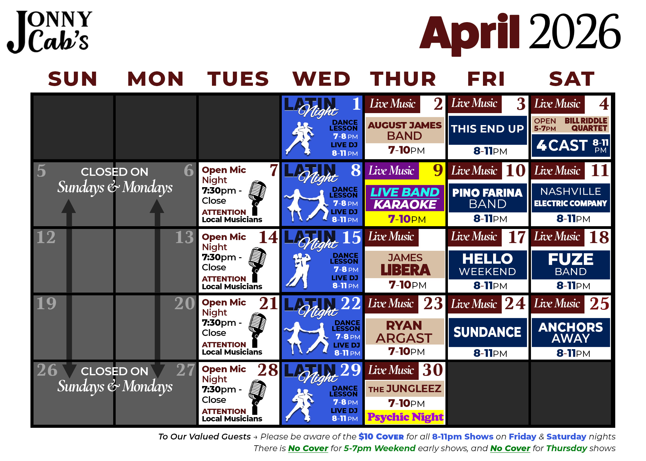 Jonny Cab's Event Schedule