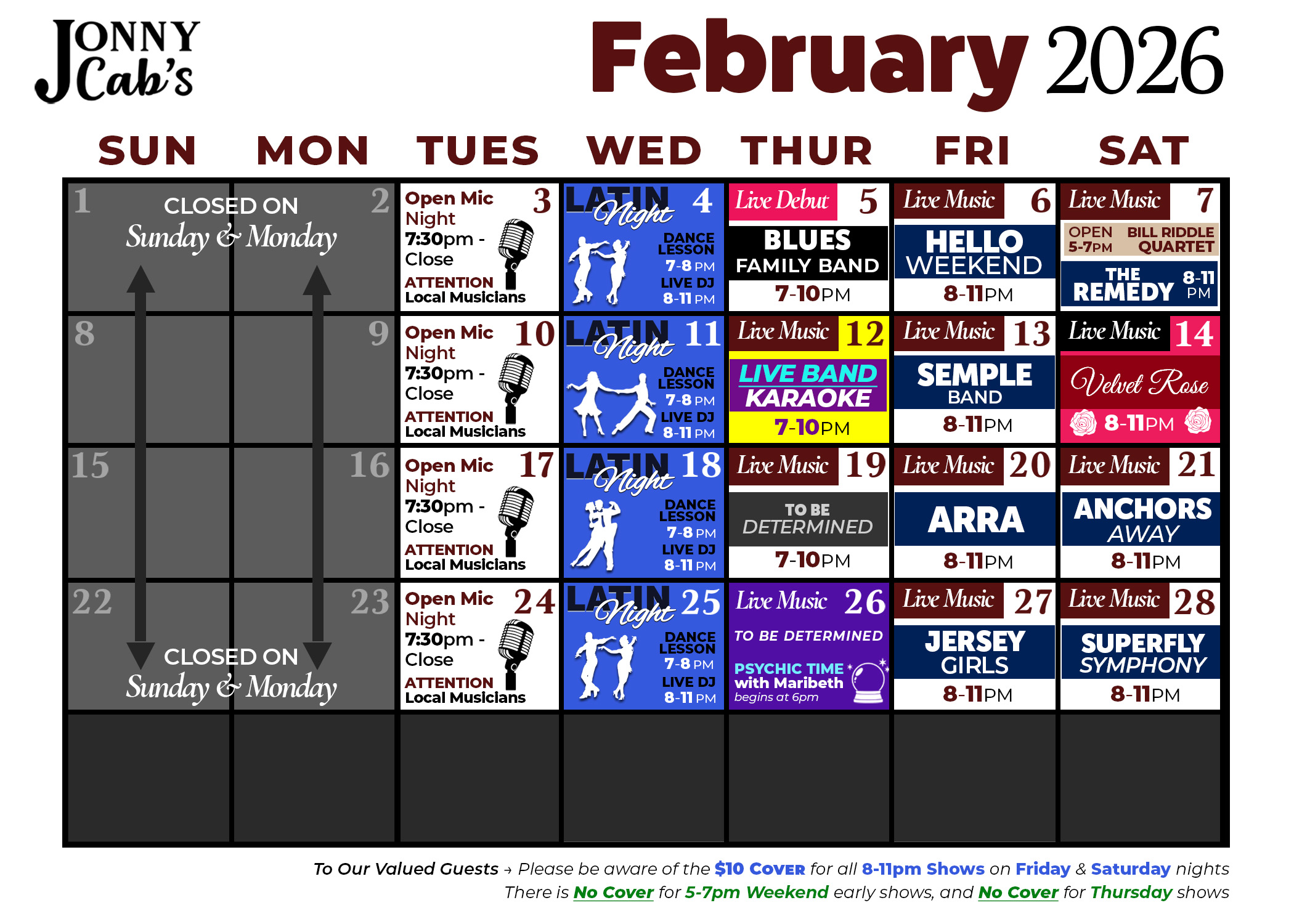 Jonny Cab's Event Schedule